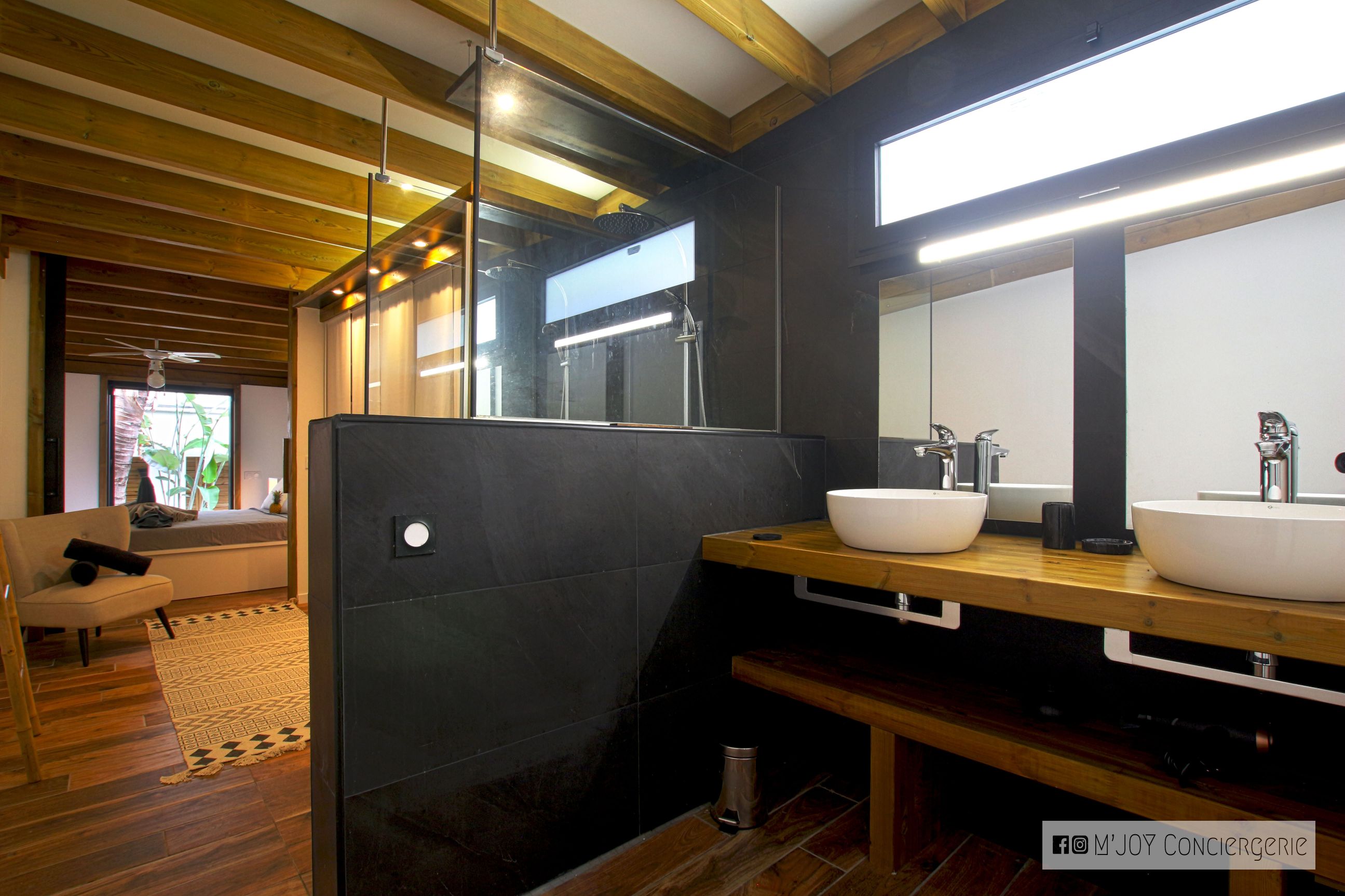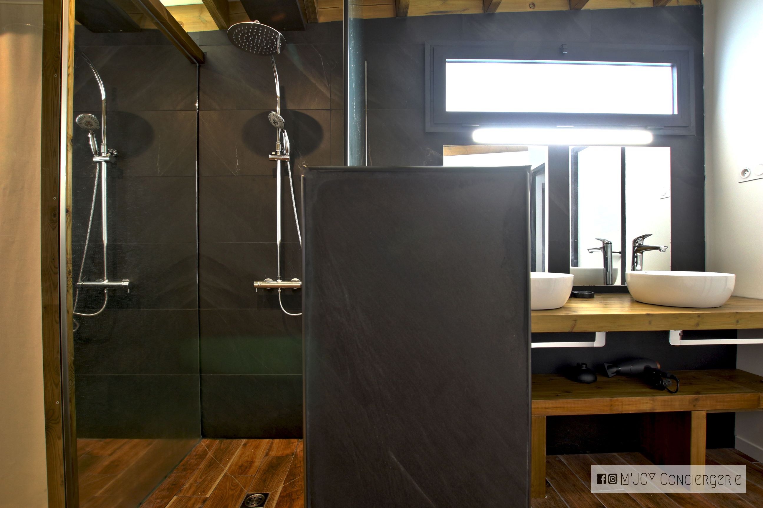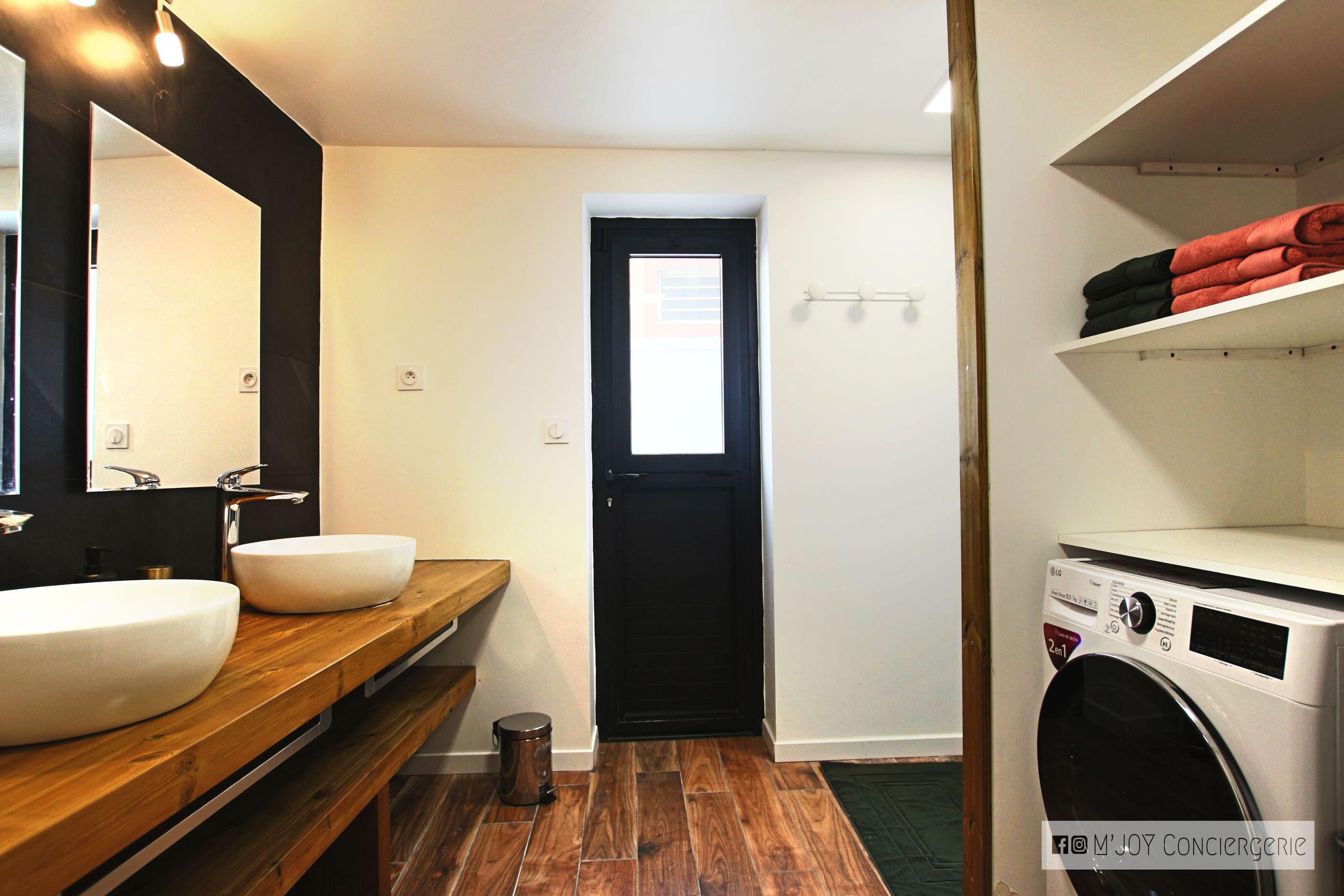 – 1 salle de bain avec douche à l’italienne, double vasque et machine à laver