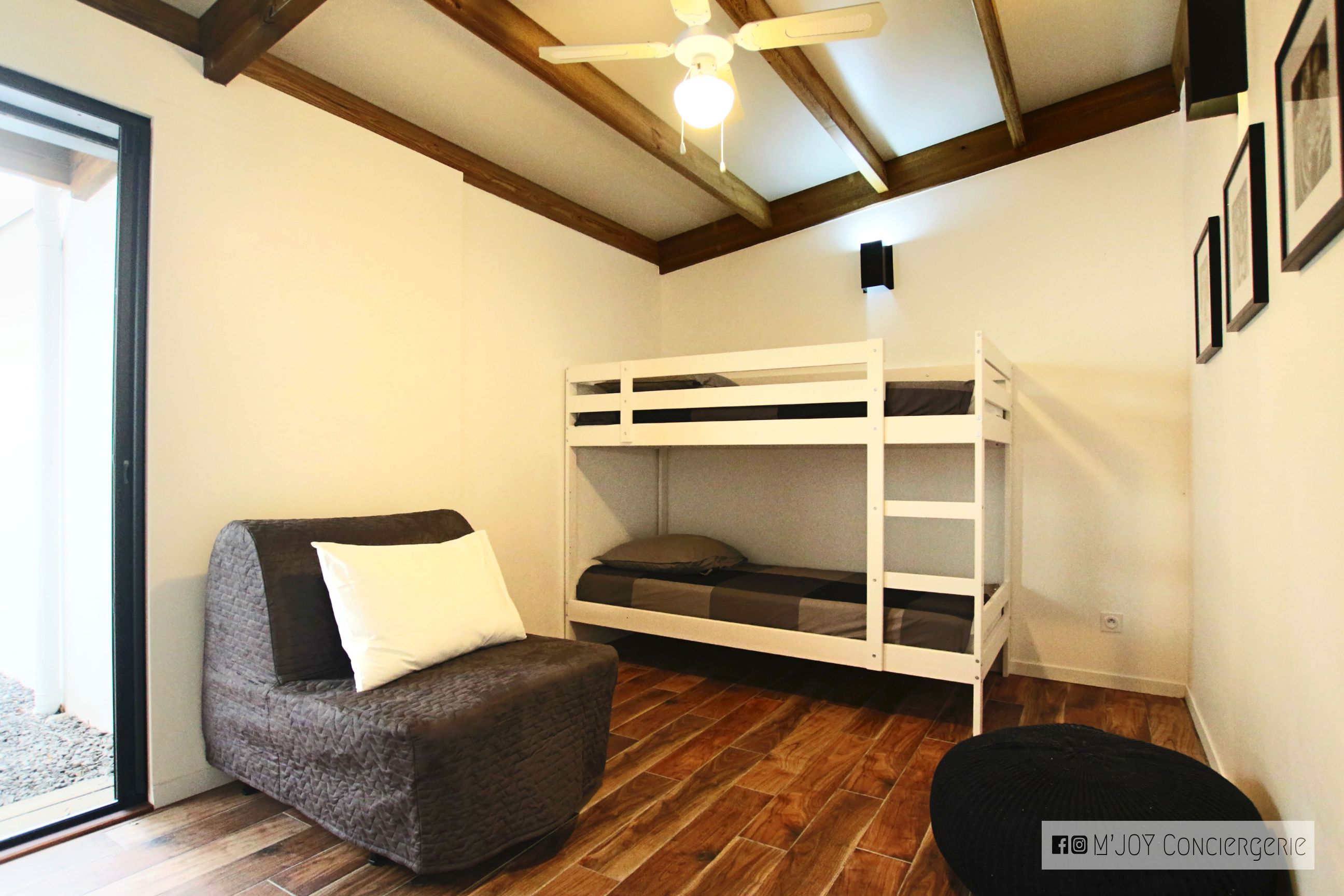 – 1 chambre enfants avec 1 lit superposé (2 couchages de 90 x 200cm) et 1 lit d’appoint (chauffeuse)